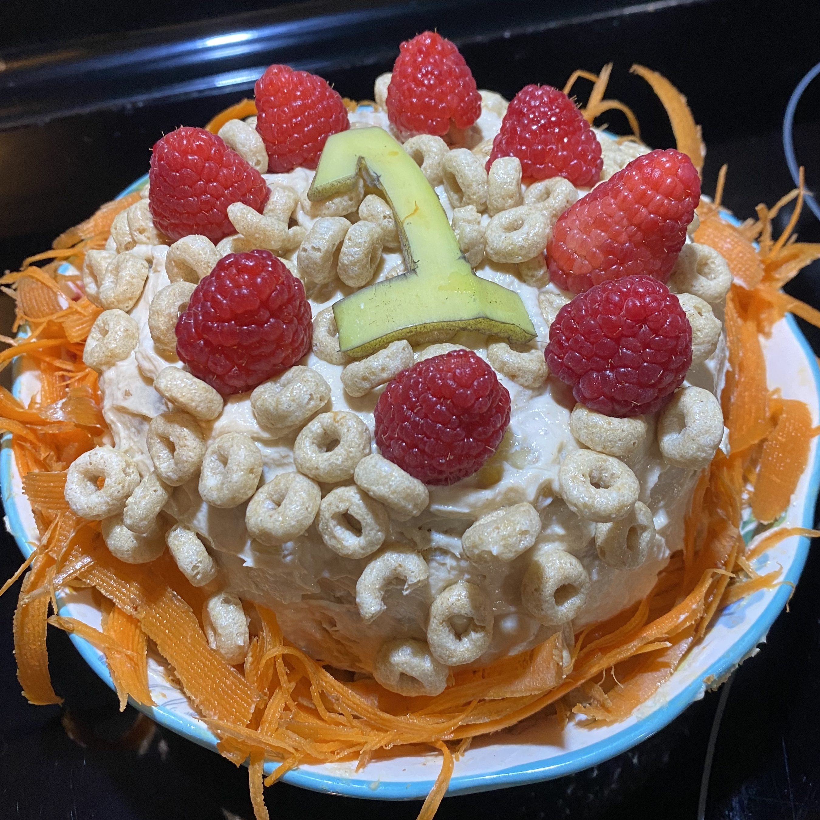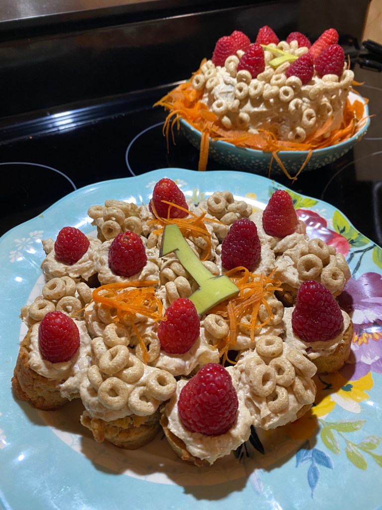 For our girls, we decided on making them mini cupcakes and a mini bundt cake. And of course we had to decorate them with some of their favorite snacks – Cheerios and raspberries! The bundt cake was stuffed with shredded carrots mixed with the leftover frosting. Honestly, I would have probably eaten these myself they smelled so good.
